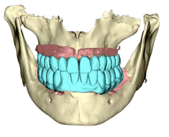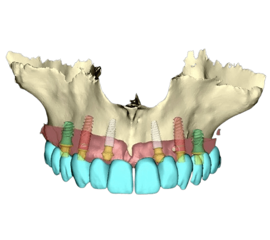 Bei einem größeren Knochen- und Weichteildefekt ersetzen wir im Rahmen des festsitzenden Zahnersatzes 3 sowohl den Knochen als auch das Zahnfleisch durch die Zahnprothese (entweder Zirkon- oder Kunststoffprothesen - mit individuell ausgewählten Zähnen aus einem hochwertigen Premium-Set und einer Zahnfleischimitation, zum Beispiel aus Gradia-Material).